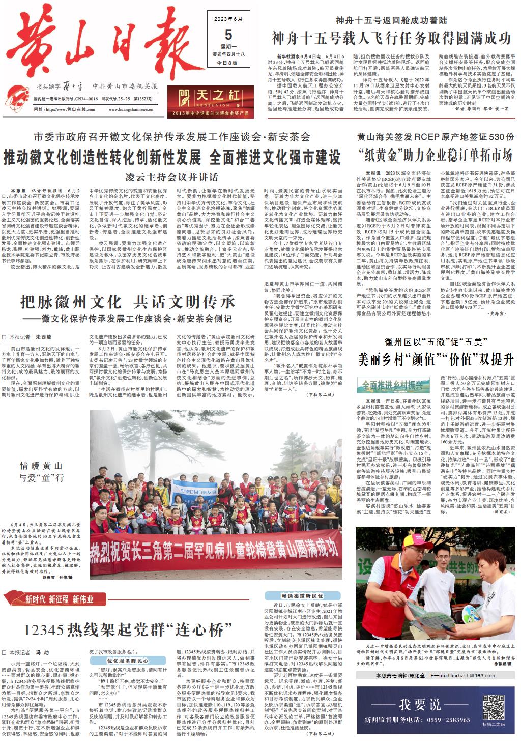 凌云强调,要着力加强文化遗产保护,以国家级徽州文化生态保护区建设为载体,以国家历史文化名城申报为抓手,在保护利用、研究阐释上下功夫,让古村古建焕发全新魅力,散发时代新韵,让徽学在新时代发扬光大。要着力挖掘徽文化时代价值,坚持用中华优秀传统文化、革命文化、社会主义先进文化培根铸魂,聚焦“德耀黄山”品牌,大力培育和践行社会主义核心价值观,深挖徽文化“和合”“善治”等优秀因子,努力在全社会形成崇德向善、见贤思齐的良好社会风尚。要着力推进文化活化传承,按照省委省政府明确定位,以文塑旅、以旅彰文,推动文旅融合,丰富多元业态,坚持艺术和数字驱动,把“大黄山”建设成为唐诗宋词水墨写意的烟雨江南,品质高端、服务精致的乡村都市,业态时尚、景美民富的青绿山水现实画卷。要着力壮大文化产业,进一步加快项目建设,加快产业布局和科技赋能,推动数字创意,将文化资源优势真正转化为文化产业优势。要着力做好文化传播文章,打造全媒体矩阵,坚持年轻化表达,加强国际化交流,让徽文化更好走向世界,成为璀璨世界历史文明天空的一束光。